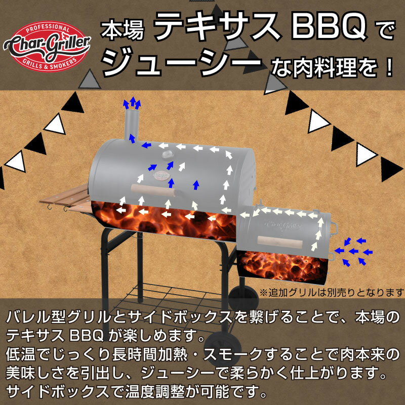 別売りのサイドボックスはこちら小サイズのバレル型グリルはこちら Char-Griller(チャーグリラー) テーブルトップ バーベキューグリルサイドファイアボックス チャコールChar-Griller(チャーグリラー) バーベキューグリルNラングラー バレル型 チャコール 23インチ 仕様 本体サイズ (約)幅107×奥行73×高さ128cm 焼き網サイズ (約)70×50cm 総重量 (約)40kg 主素材 スチール その他 組み立て式 英語組立説明書付 製造国 アメリカ バーベキューグリルや炭などBBQアイテムはこちら スモーカー、スモークウッド、スモークチップなどスモークアイテムはこちら