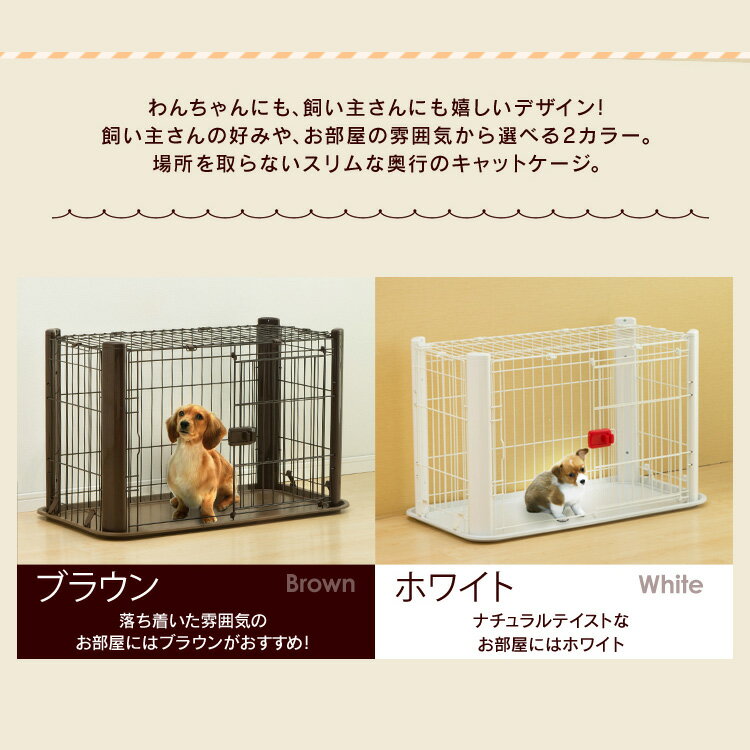 ●カラー:ホワイト・ブラウン ●商品サイズ(cm):幅約91x奥行約50x高さ約58 ●重量(約):6.5kg ●適応種(目安):小型犬向 ●入口サイズ(約):幅約30x高さ約48 ●トレー内寸(約):幅約86x奥行き約45 ●主要材質:線材:スチール(エポキシ粉体塗装)、トレー:塩化ビニル樹脂、ロック・支柱:ABS樹脂、線材ジョイント・バックル:ポリプロピレン樹脂 ★