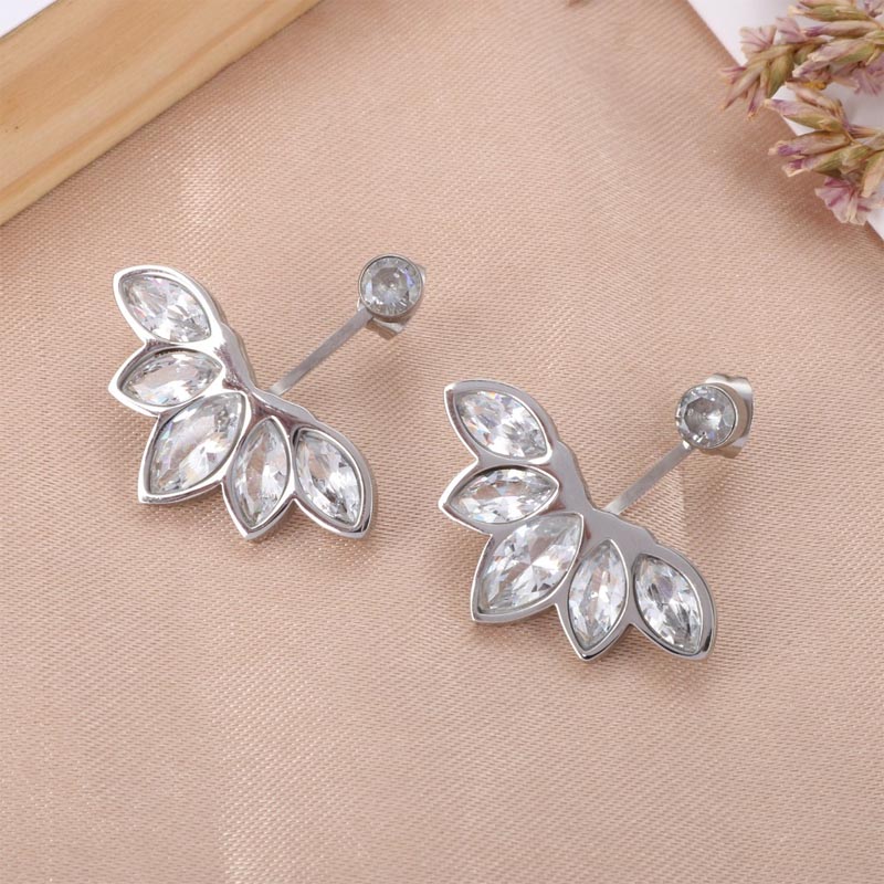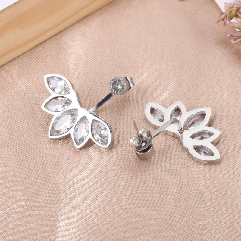 流線型のクリスタルを5個並べてハスの花(ロータスフラワー)のステンレス製のバックキャッチを5mmの丸い台座型のステンレスピアスにセットしたジャケットピアスタイプのステンレススタッドピアス。