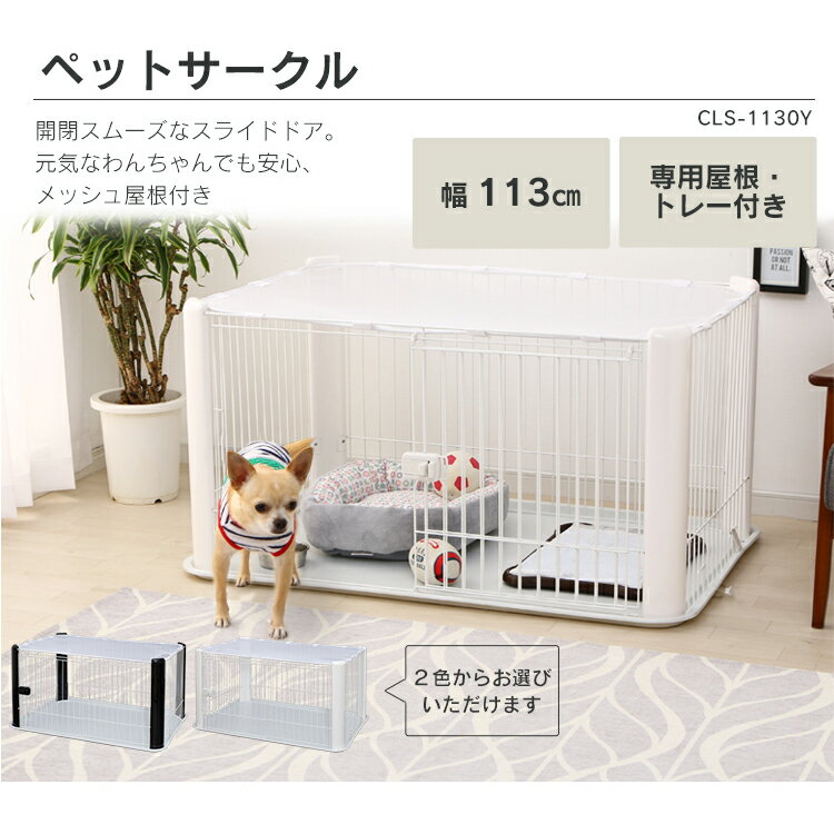 ■セット内容ペットサークル CLS-1130Y ブラックorホワイトシーツぴたっとトレー ワイド P-SPTW ブラウン丸洗いできるペットベッド MPB-390 ブルー/ボーダー■カラーを選択する商品ペットサークル:ブラック・ホワイト【ペットサークル CLS-1130Y】●商品サイズ(cm)本体:幅約113×奥行約79×高さ約60入口サイズ:幅約41.7×高さ約52.5トレー内寸:幅約102.8×奥行約67.4●商品重量約9.2kg●材質【本体】線材:スチール(エポキシ紛体塗装)トレー:PVCロック、支柱:ABS樹脂【屋根】メッシュ:ポリエステル100%線材:スチール(亜鉛メッキ)●適応犬種(目安)小型犬、中型犬●必要工具+ドライバー※握り部分が直径3cm以上の物をご使用ください。